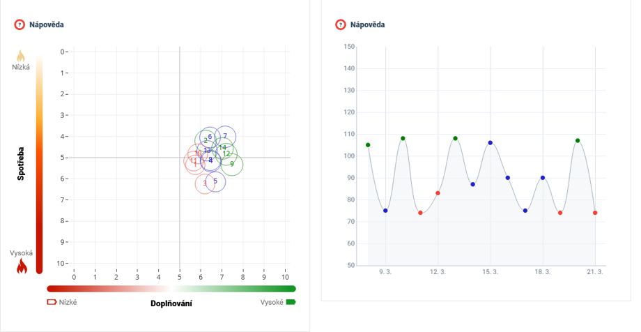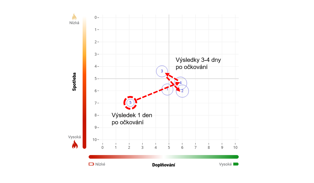 Ze zájmu o vysledování reakcí organismu na očkování proti COVID-19 jsme požádali vybrané zdravotníky, aby pomocí mySASY proměřili stav svého HRV ve dnech přímo po vakcinaci. Výsledky nám potvrdily očekávaný průběh, tedy výrazné snížení adaptační kapacity. U konkrétního obrázku výše šlo o silnou reakci (viz kolečko č. 5) snižující první den po vakcinaci celkový výkon ANS, snižující aktivitu doplňování a zvyšující spotřebu/aktivaci organismu. Celkové snížení adaptační kapacity a vychylující reakce způsobená vakcinací byly u tohoto subjektu pozorovatelné čtyři dny.
